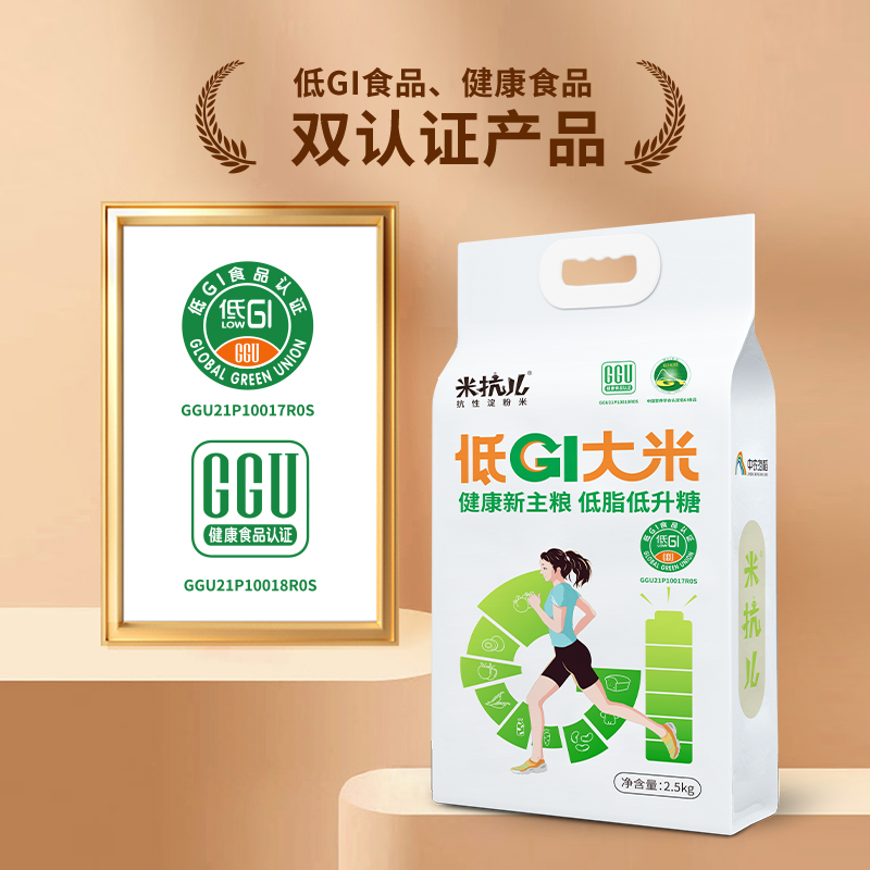 米抗兒抗性淀粉米是一款GI值為48.9、GL值為5.9、經(jīng)過健康食品、低GI食品權(quán)威認證、獲得中國營養(yǎng)學(xué)會預(yù)包裝食品低GI標識使用符合性證書,是一款全家人皆可食用的健康低GI大米。